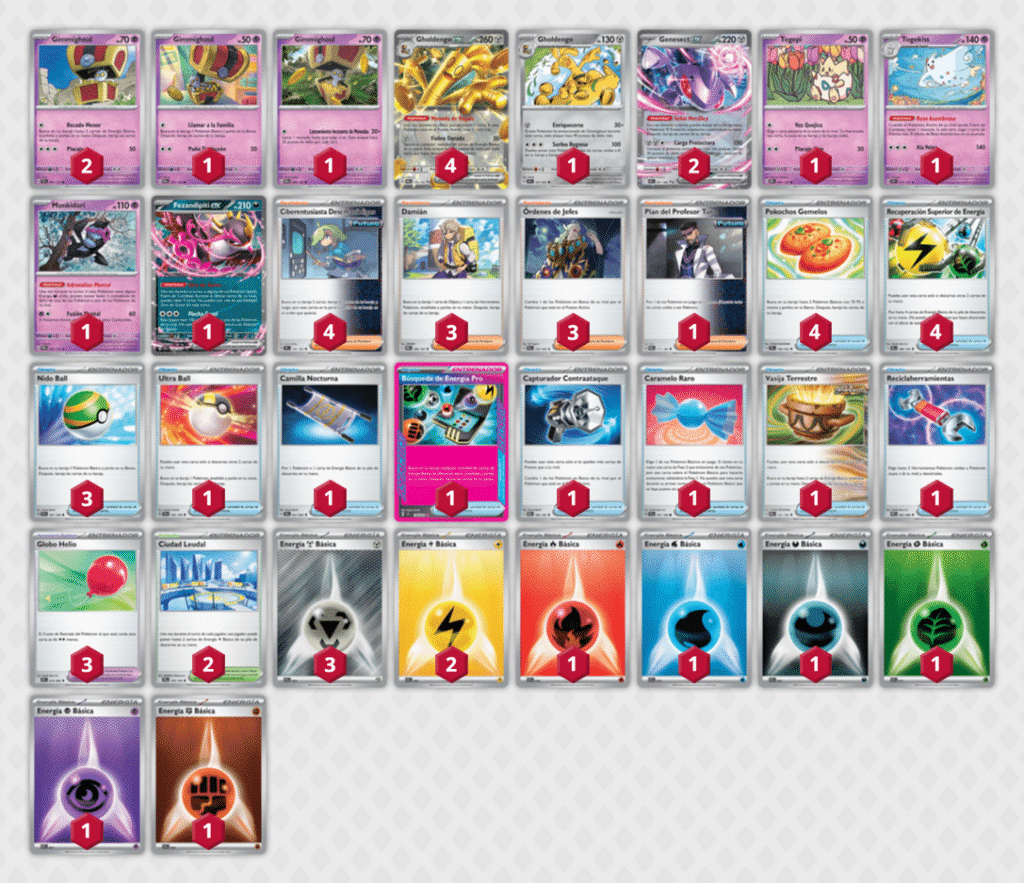 Pero un nuevo competidor ha irrumpido con fuerza: Gholdengo ex, un mazo que ya se ha ganado su lugar entre los más poderosos. En este análisis veremos cómo funciona, qué cartas lo potencian y cuáles son sus puntos fuertes y débiles. Echemos un vistazo, más concretamente, a una lista que ha hecho top 6 en el regional de Pittsburgh del 20 de septiembre, pilotada por el estadounidense Destynn Hatcher.