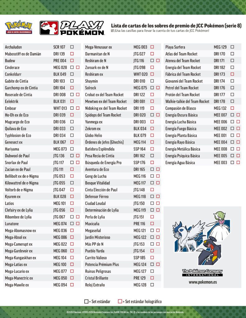 La Serie 8 es especialmente relevante porque introduce Megaevolución por primera vez en los sobres de premio Play! Pokémon, además de ampliar el soporte a arquetipos actuales del ciclo Escarlata y Púrpura.